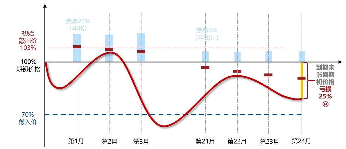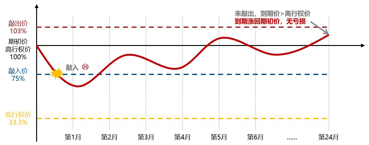 发生敲入后,若到期前未敲出,且到期价低于低行权价,则亏损为100%名义本金。