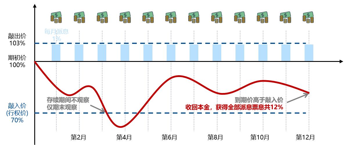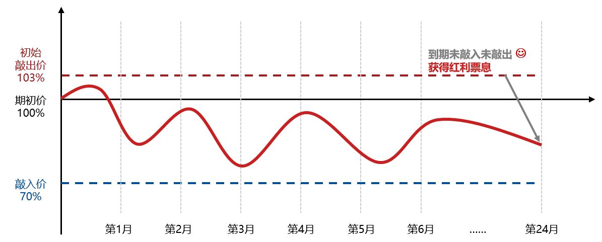 特点:不涨破敲入价就能获得票息收益,且存续期间越长,收益越高。具备上涨安全垫,即使大涨,亏损也不大于持有标的资产本身,即以期初价格建仓标的资产空头带来的亏损。