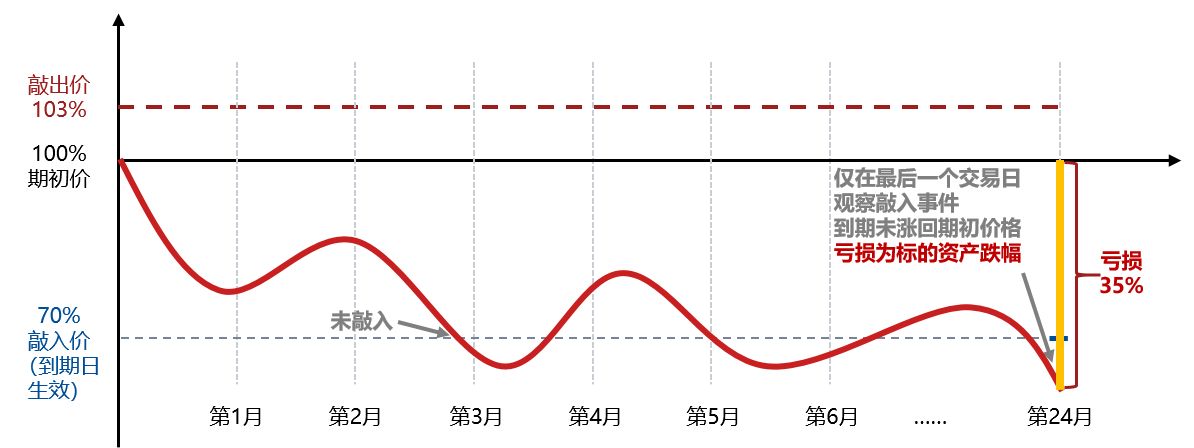 发生敲入后,如果到期前未敲出,则亏损为标的到期价格相对于行权价的跌幅。如果标的到期价格高于行权价,则不亏损。